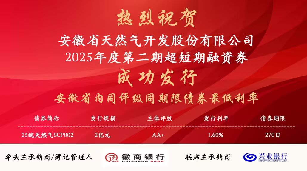 9月1日,省天然氣公司在銀行間債券市場成功發行2025年度第二期超短期融資券(以下簡稱“超短融”),發行規模2億元人民幣,期限270天,票面利率1.60%。
