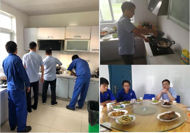5月31日傍晚,壓縮公司支部書記楊國生、黨員王冠南一行從合肥來到池州加氣站,直接鉆進了員工廚房。在站里員工王偉、昂朝玲的幫助下,一起擇菜、洗菜、切菜、調佐料……20分鐘,一切準備就緒。楊國生點火掌勺第一道菜紅燒排骨,王冠南掌勺第二道菜紅燒鳊魚、青椒炒雞蛋……不一會,自掏腰包、親自烹飪的“八菜一湯”上齊了,順利實現“同做一桌菜”的小目標。