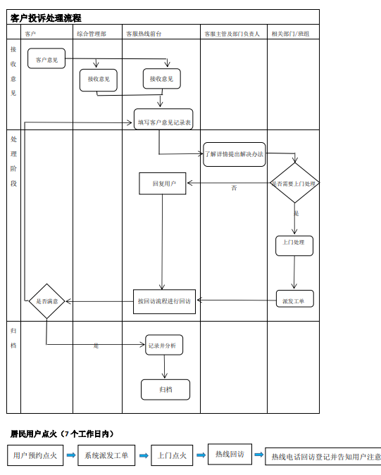 10、營業人員業務受理完畢時,應告知客戶所辦理業務的開通時限和客戶服務熱線電話。并遞上回執和書寫用具告知點火人員聯系方式便于預約,請客戶簽收回執。